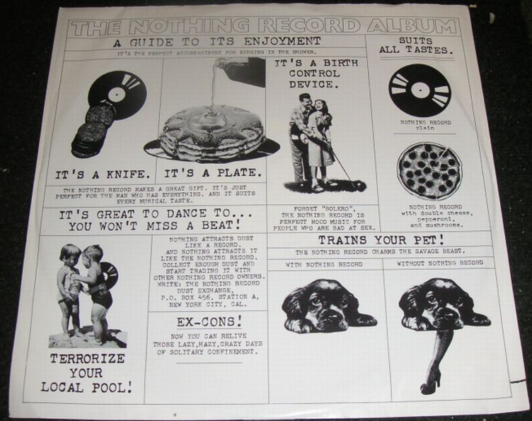 För det är det som är humorn med "The Nothing Record Album". Den marknadsförs på omslag och innerfodral som om det är den mest fantastiska och nyskapande plattan någonsin, sprängfylld med kanonhits, allt kryddat med stor ironi, och den är uppdelad i spår som en vanlig vinylskiva. Det medföljer textblad och poster till skivan, men dessa är förstås bara blanka blad. För när man sätter på den så hörs inte ett dyft utan spåren är tysta. Skivan är alltså tom och tyst. Därav titeln "The Nothing Record Album". Jag tycker detta är jättekul och bisarr humor och någonstans förstod jag direkt när jag hittade plattan att det var något lurt med den och att jag måste bara ha den.